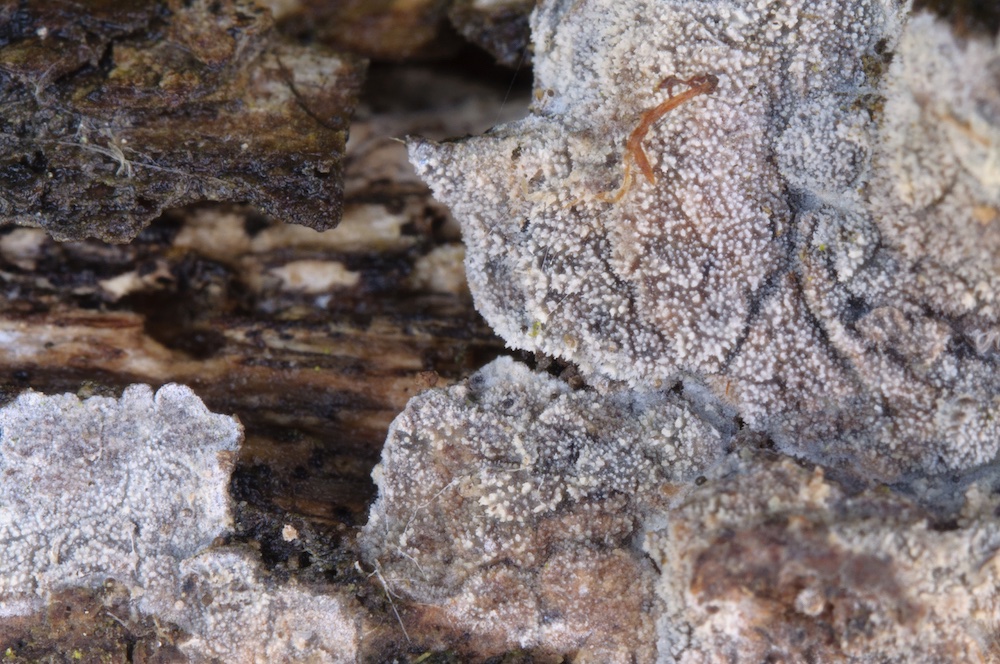 Protomerulius pertusus: Laubholz-Stamm, Unterseite. Ebenfalls mit Spirin et al. bestimmt, wichtige Merkmale: Helle, flockige Fruchtkörper und schlanke Zystiden.