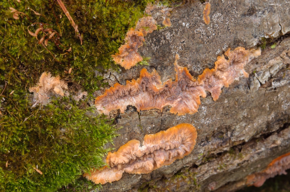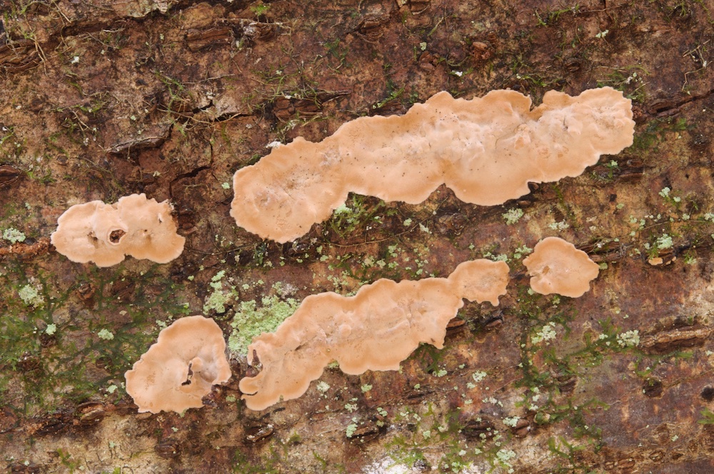 Dacryobolus karstenii: Pinus-sylvestris-Stämme. Hab ich im Dezember 2020 zum ersten Mal gefunden, ansonsten gibt es noch einen sicheren Nachweis von Romana in Ö.