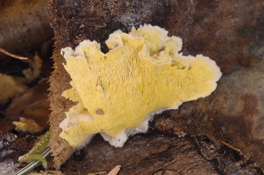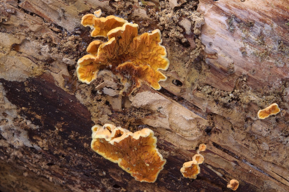 Antrodiella citrinella (= Flaviporus citrinellus): Der erste steirische Nachweis dieses hübschen und intensiv erforschten "Urwald-Pilzes", der nur auf bereits von Fomitopsis pinicola zersetztem Holz vorkommt. So auch hier, auf liegendem Nadelholzstamm, direkt auf bzw. neben einem alten Fom.-pin.-Frkp. .