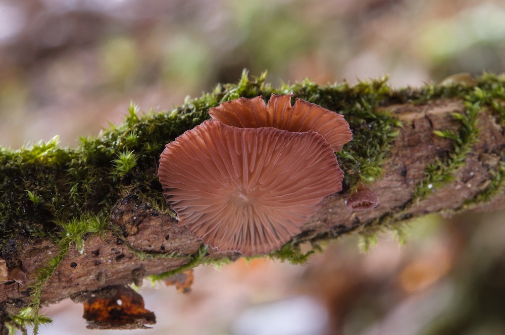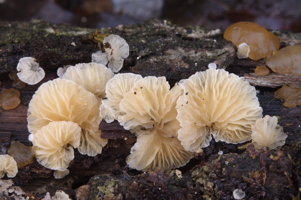 Panellus violaceofulvus: Abies-Äste und -Wurzel eines liegenden Stammes im Luftraum. .