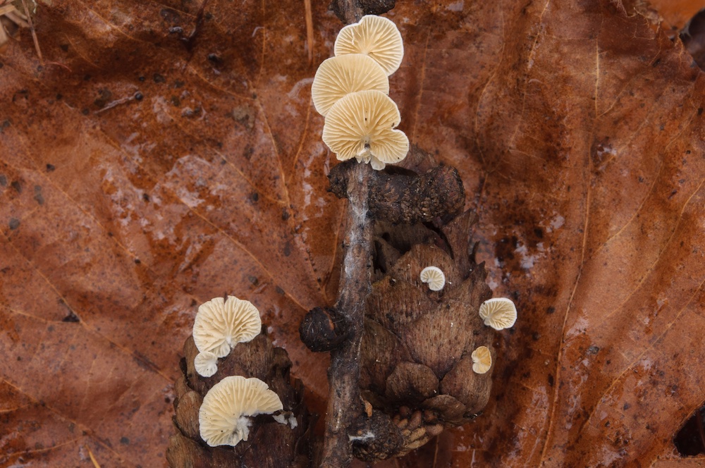 Crepidotus epibryus: Quercus-Ast und Larix-Zweig. .