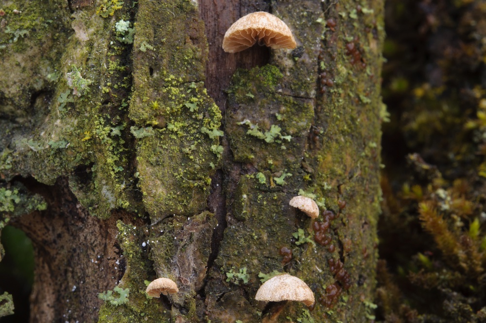 der Dezember hatte wieder einige spannende Pilze zu bieten, natürlich hauptsächlich Holzbewohner. Aufgrund des (mehr oder weniger) langsam schmelzenden Schnees war das Totholz gut durchfeuchtet, erst gegen Ende des Monats zeigten einige stärker besonnte Stellen schon wieder Zeichen des oberflächlichen Austrocknens – zum Glück soll übermorgen aber wieder ein Feuchtigkeits-Nachschub kommen.