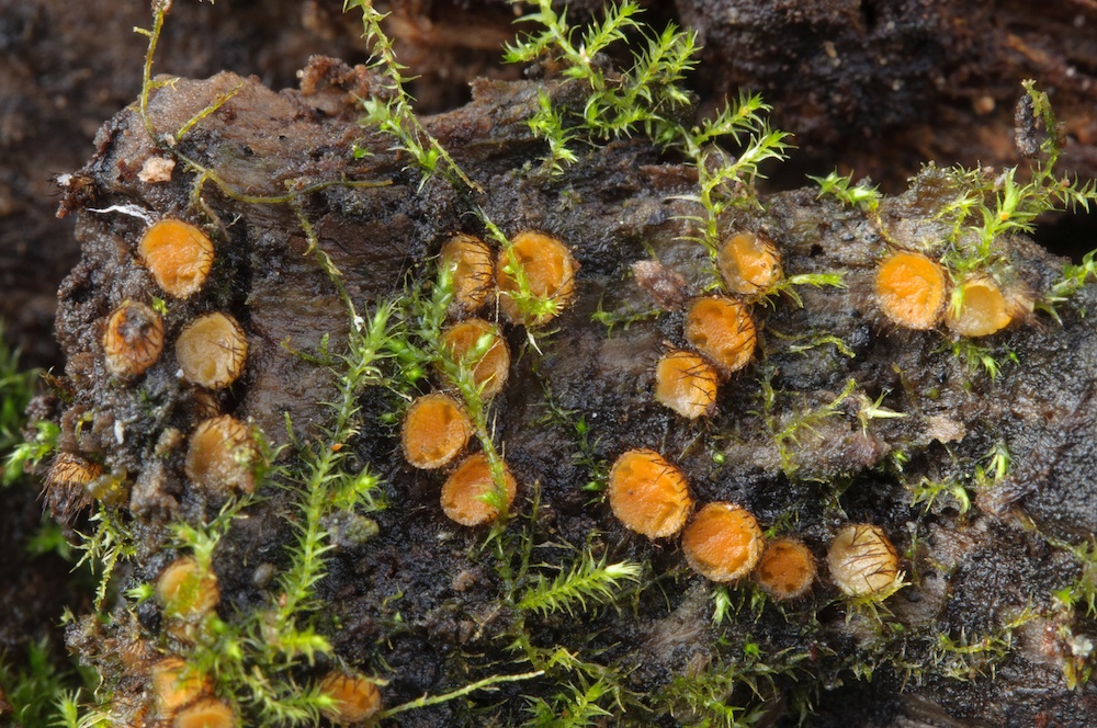 Scutellinia setosa: Sehr gedrängt auf der Borke eines liegenden Populus-Stammes wachsend. .