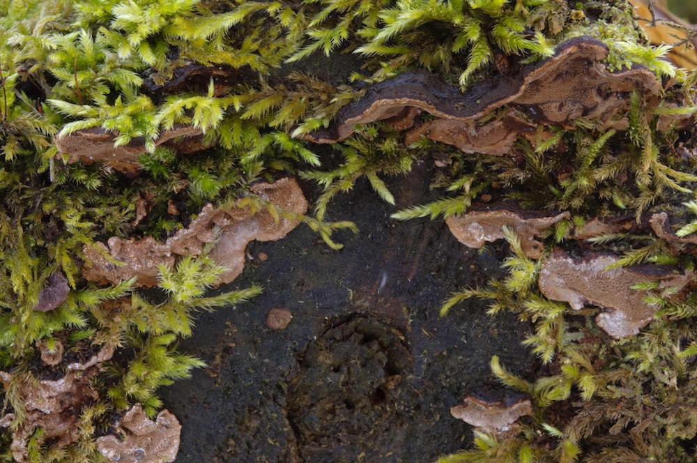 Aporpium canescens: Morscher Fagus-Stamm. Habe ich letztes Jahr auch schon mal gezeigt, hier hat sich leider die Hoffnung auf A. macroporum aufgrund der Sporenmaße nicht bestätigt, trotzdem natürlich ein schöner Nachweis. .