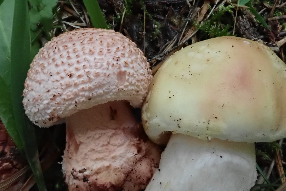 Amanita rubescens var. annulosulfurea - beim ersten Foto ist Amanita rubescens nebeneinander mit der Varietät annulosulfurea zu sehen.
