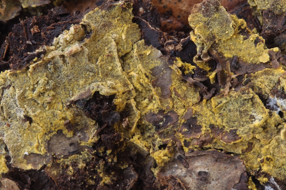 Athelidium aurantiacum: Liegender Laubholz-Ast, evtl. Corylus, auf Rinde; soc. Gyrophanopsis polonensis. Trotz der oben angesprochenen widrigen Bedingungen können besondere Funde gelingen, so z. B. dieser makroskopisch auffällige, europaweit sehr seltene Rindenpilz. .