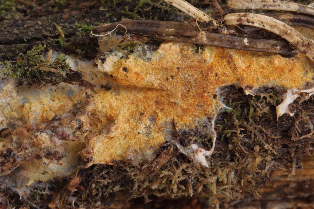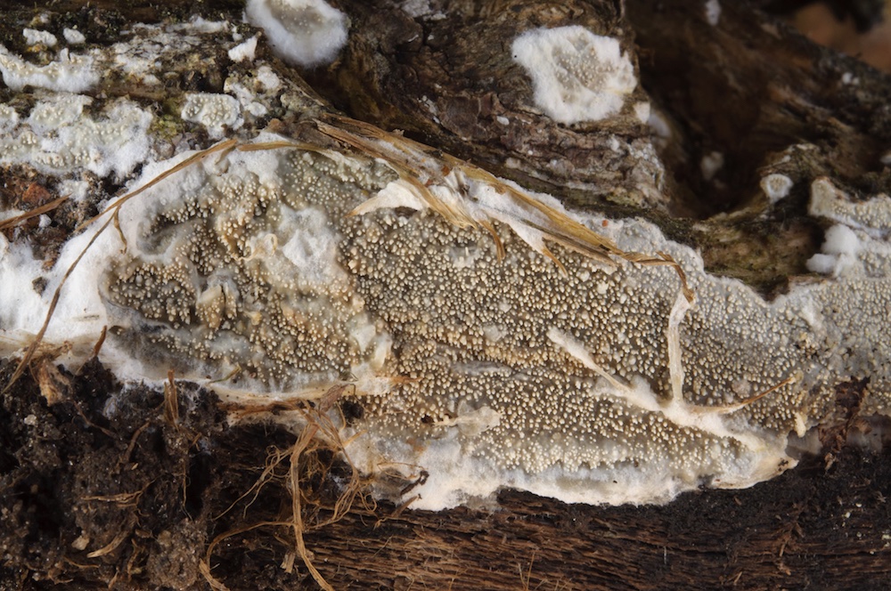 Cylindrobasidium laeve: Liegender Acer-pseudoplatanus-Ast. Oft passiert es natürlich auch, dass man einen ungewöhnlich/interessant aussehenden Rindenpilz wie diesen hier mitnimmt aber er sich dann doch nur als eine extrem häufige Art herausstellt... .