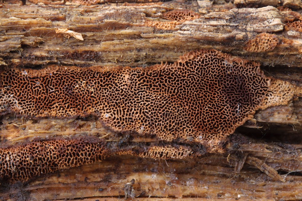 Fuscoporia viticola: Liegendes Picea-Holzstück, Unterseite. .