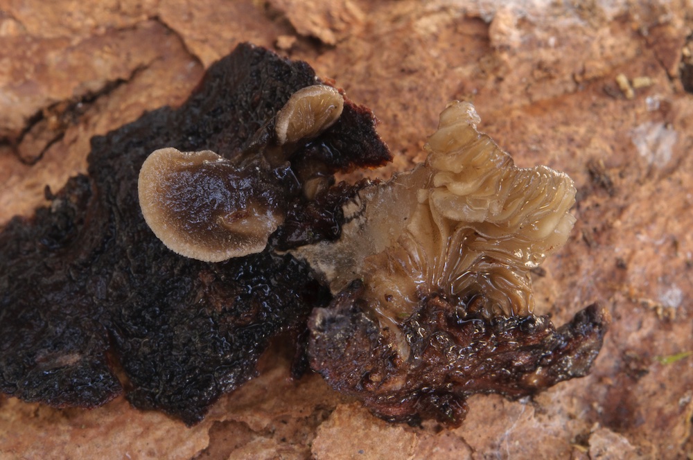 Hohenbuehelia josserandii: Liegender Abies-Ast. Im Feld komplett eingetrocknet, musste also erst wiederbefeuchtet werden, leider nur wenige kleine Fruchtkörper. .