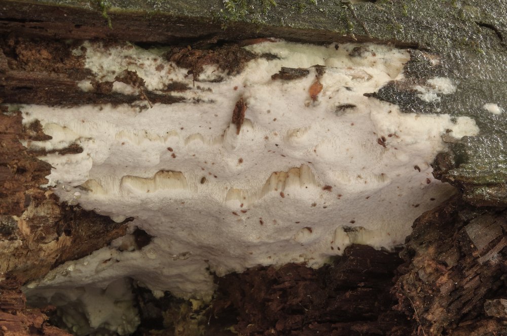 Sarcoporia polyspora: Unterseite eines liegenden Nadelholz-Stücks (wohl Pinus). .