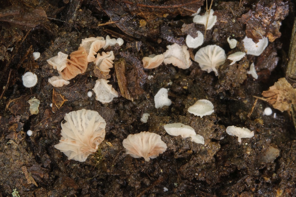 Gymnopus inodorus: Liegendes Borkenstück in der Laubstreu.
