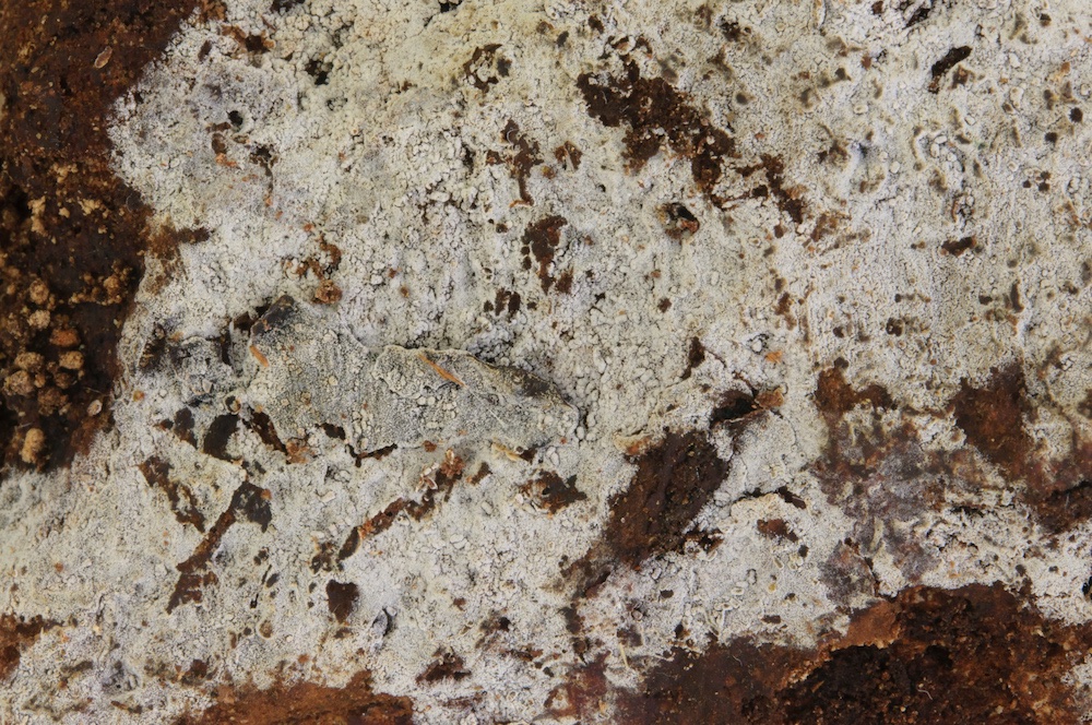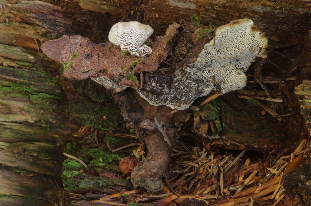 Skeletocutis kuehneri: Liegender Picea-Stamm, auf alten Fruchtkörpern von Trichaptum abietinum. .