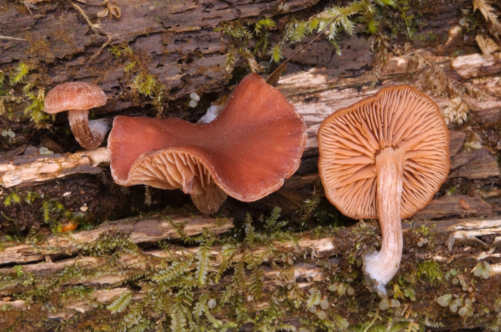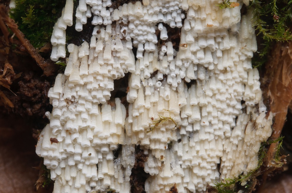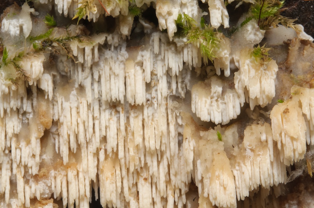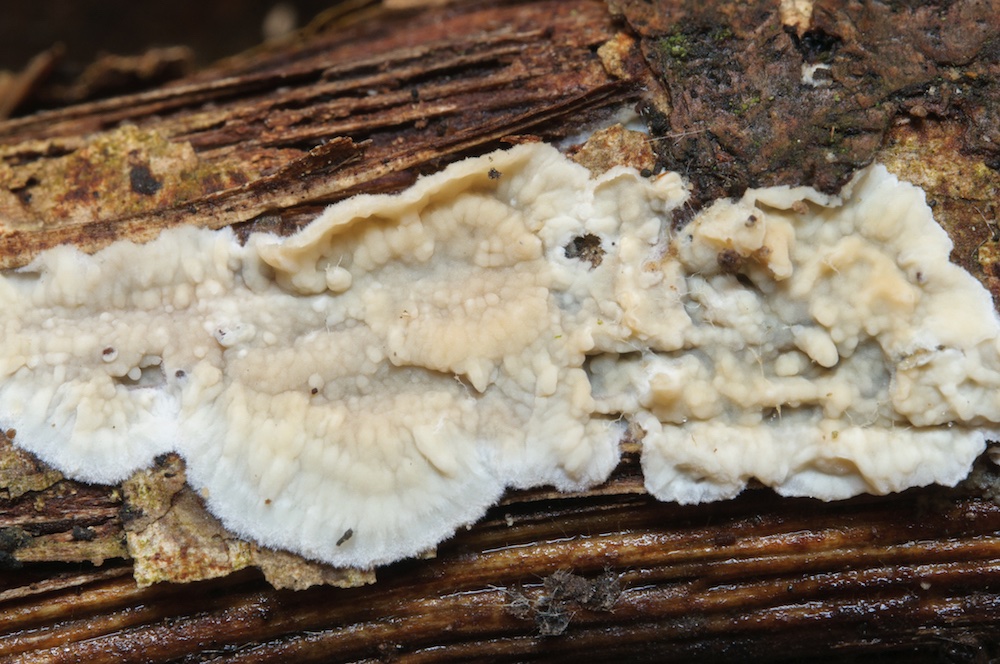 Clavulicium macounii: Stark vermorschter, dicker Nadelholzstrunk, direkt am Bachufer.