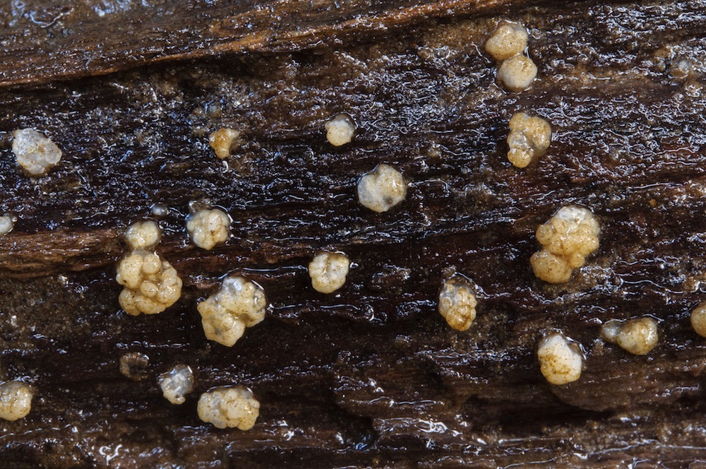 Encoelia fimbriata: Auf Hydnoporia corrugata auf liegendem Laubholz-Ast. Ohne Einträge in der Datenbank.