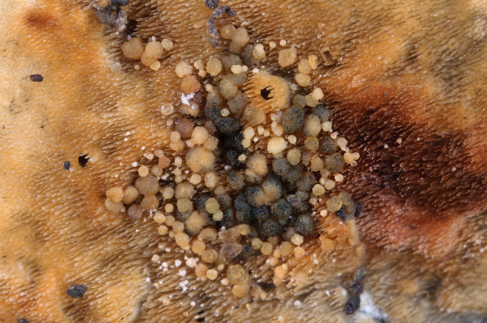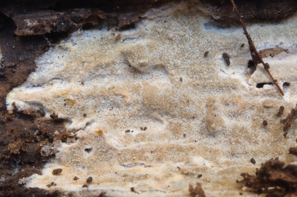 Trichoderma thelephoricola: Liegender Ast von Alnus glutinosa, auf bzw. bei alten Fruchtkörpern von Steccherinum ochraceum.