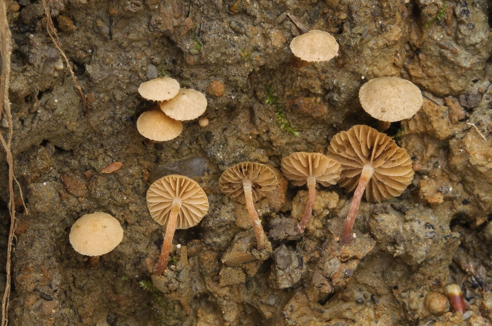 Zunächst aber noch ein Nachtrag vom 1. April dieses Jahres. Da fand ich einen kleinen Braunsporer mitten auf nackter, lehmiger und feuchter Erde an der Böschung eines Quellbereiches, den ich zunächst nicht bestimmen konnte und in der Nähe von Flammulaster vermutet hatte. Mittlerweile habe ich aber gute Übereinstimmungen mit "Deconica" subfusispora gefunden. Dass es sich dabei um keine echte Deconica handelt, war relativ klar, aber eine passende Gattung gibt es momentan wohl nicht. Lothar Krieglsteiner hat die Art hier vor kurzem ausführlich vorgestellt: http://www.pilzkunde.de/index.php/pilz- ... ts?start=1. Dort findet sich auch ein Zitat eines aktuellen Artikels über diese Art von A. Karich.