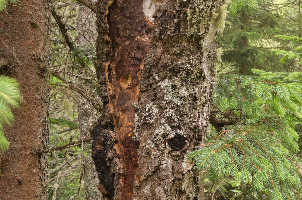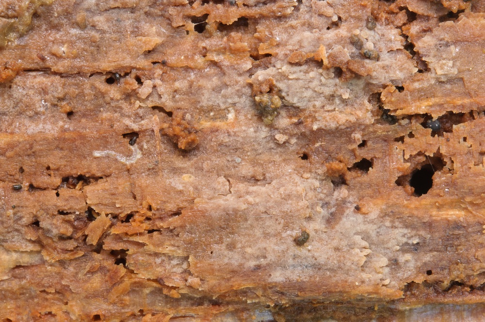 Tilachlidium brachiatum: Alte Pilzfruchtkörper auf einem Picea-Strunk.