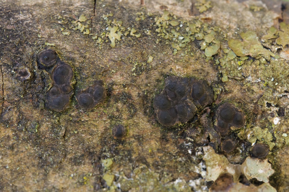 Nemania serpens var. hydnicola: Unterseite eines alten Fruchtkörpers von Fomitopsis pinicola. .