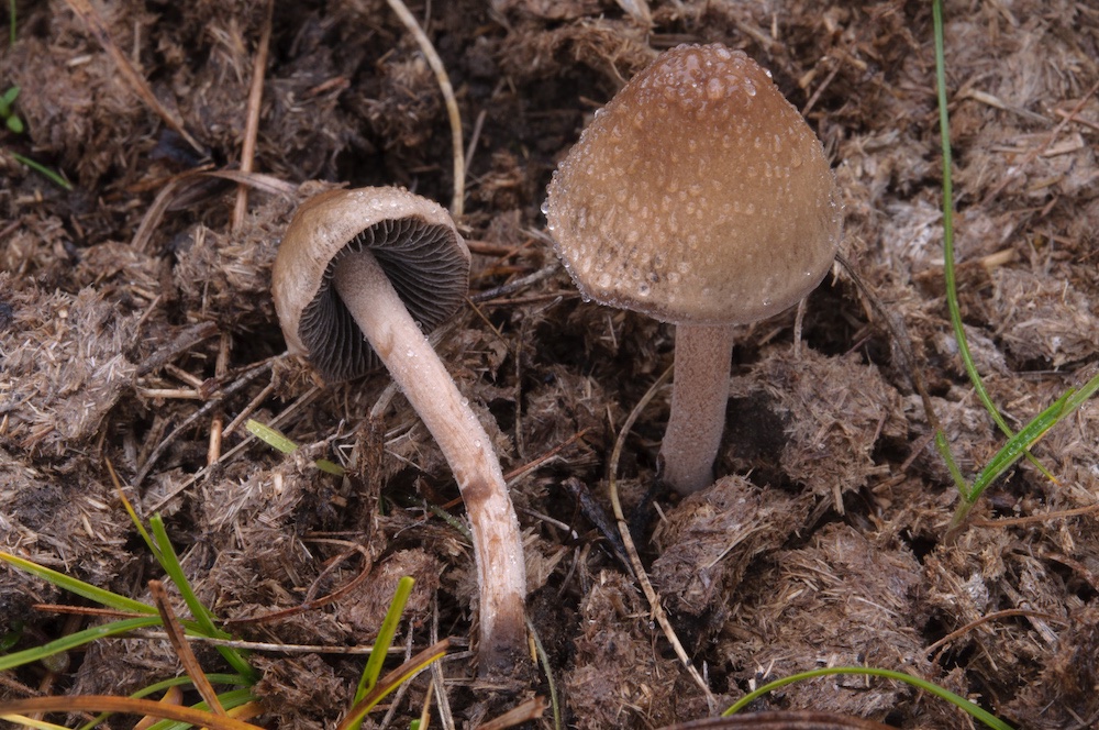 Panaeolus cinctulus: Kalktrockenrasen (oben) und Kuhflade (unten). Der obere Fund könnte aufgrund der Ökologie zu P. dunensis gestellt werden, wobei es sich dabei wohl um ein noch nicht abschließend geklärtes Taxon handelt.