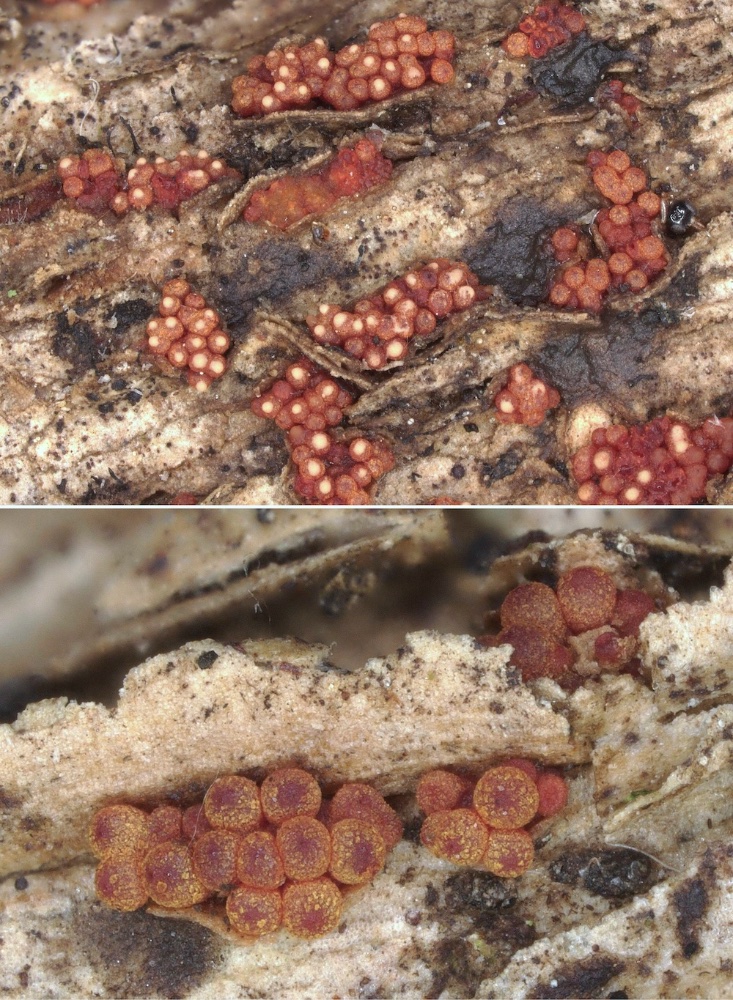 Stereopsis vitellina: Zum Abschluss noch ein Pilz, der mich besonders gefreut hat. Gefunden in einem fichtendominierten Nadelwald auf einem Wurzelweg. Von Nordeuropa abgesehen, ist S. vitellina in Europa eine große Seltenheit. Für Österreich dürfte dies der Erstnachweis sein.