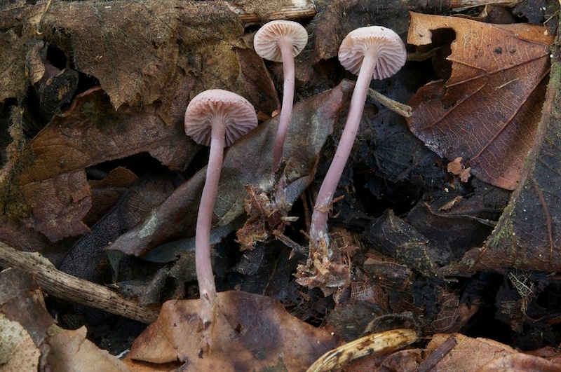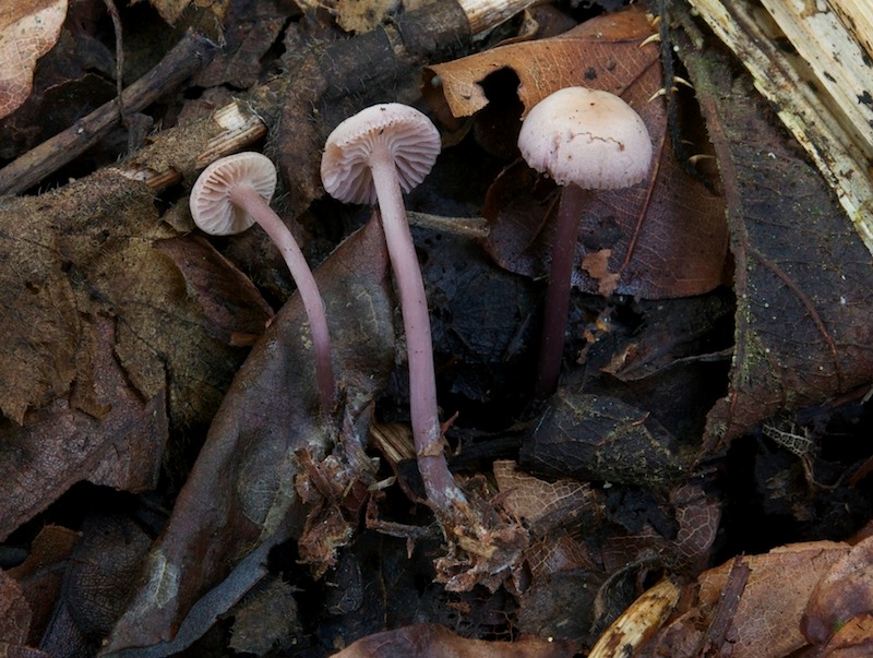 Äußerlich wie eine sehr schmächtige Mycena pura, jedoch mit leicht herablaufenden Lamellen. Die Sporen sind außerdem inamyloid, Pleurozystiden hab ich auch keine gesehen – passt also gut zu M. pearsoniana.