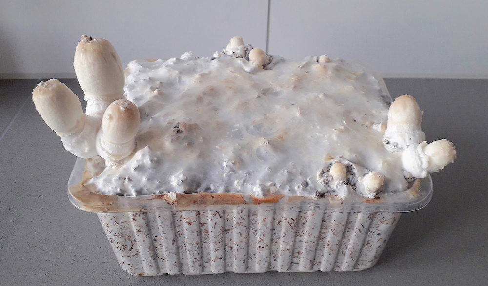 Mein erster Versuch mit diesem Speise- und Medizinalpilz. Das Substrat besteht aus kompostiertem Pferdemist