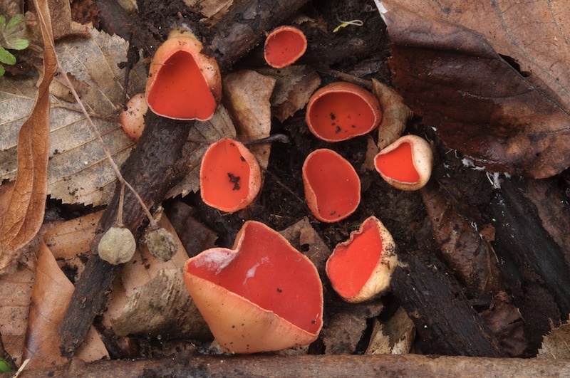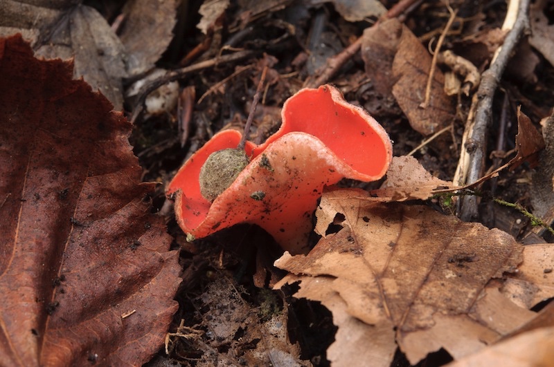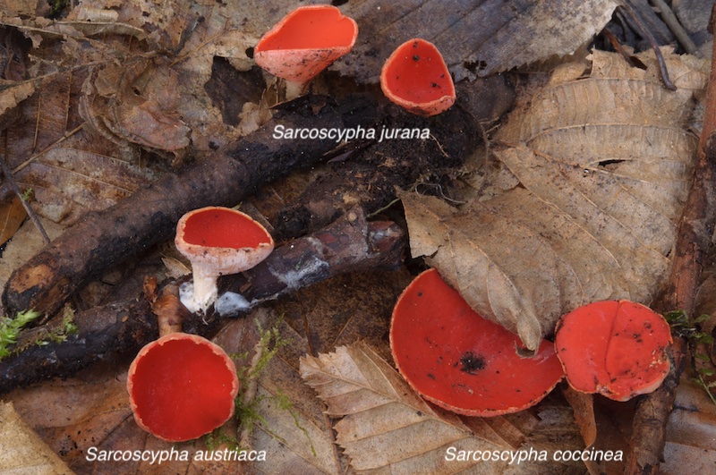 wo es derzeit feucht genug ist, hat man gute Chancen, auf Kelchbecherlinge zu stoßen – mit etwas Glück sogar auf zwei verschiedene Arten, S. austriaca und S. coccinea. Noch deutlich mehr Glück, welches mir bislang fehlte, braucht man, um die dritte Art im Bunde (S. jurana) zu finden...