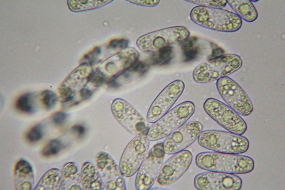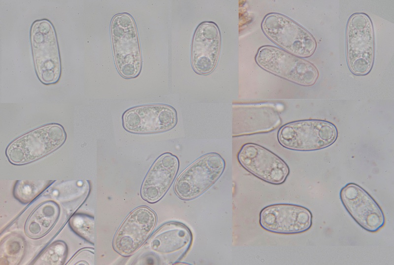 Typisch sind die eingedrückten Enden, die beiden großen Tropfen und die vollständige Schleimhülle bei unreifen bzw. manchmal auch frisch ausgeschossenen Sporen (an der Spore links unten im Schlauch zu erkennen).