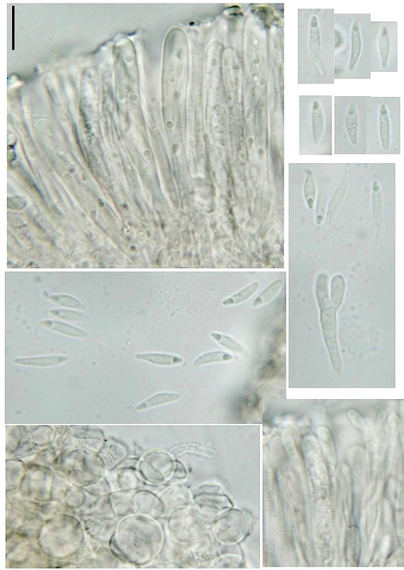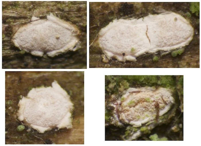 Vielen ist die Gattung Propolis ein Begriff, hauptsächlich aufgrund der ausgesprochen häufigen Art Propolis farinosa (= P. versicolor), die sowohl im Luftraum als auch auf liegendem Holz, besonders von Laubbäumen, wächst. Auf Nadelholz-Ästen im Luftraum in montanen/subalpinen Gebieten ist sie mir bisher aber noch nie untergekommen (was natürlich nicht heißen soll, dass sie da nicht vorkommen kann; in niedereren Lagen fand ich sie selber schon auf Picea). Auf solchen Ästen sammle ich stattdessen regelmäßig zwei andere Propolis-Arten, die häufigere (oder zumindest auffälligere!) davon ist meiner Erfahrung nach Propolis rhodoleuca. Sie fruktifiziert oft sehr zahlreich und ist aufgrund der Ökologie und der strahlend weißen, z. T. aber auch schwach rosa gefärbten Fruchtkörper mit gewisser Erfahrung schon im Feld mit großer Wahrscheinlichkeit anzusprechen. Mikroskopisch fallen die ± ellipsoiden, höchstens schwach gekrümmten Sporen auf, die natürlich vollkommen von denen von P. farinosa abweichen.