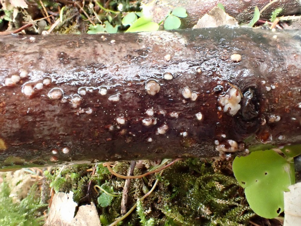 ich habe mir vor kurzem einen an einem Bächlein vom Spritzwasser benetzen Laubholzast angesehen und darauf durch die Rinde durchbrechende weisse Gallertpilze gefunden. Das Mikroskop hat gezeigt, dass es ein Heterobasidiomycet ist und ich vermute es handelt sich um Achroomyces (Platygloea) disciformis.