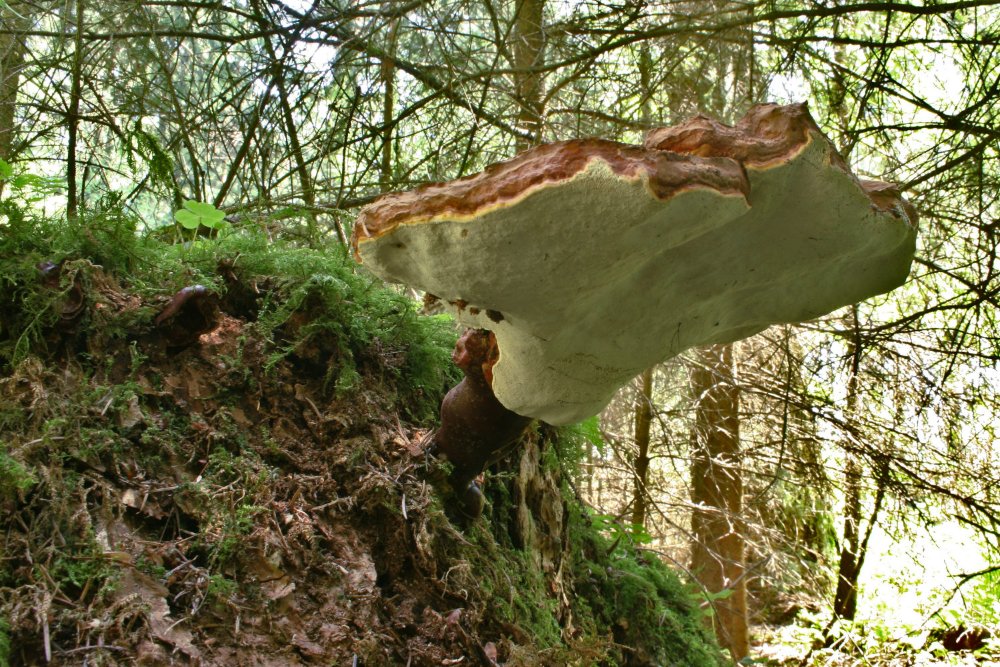 Ulmer Hochsträß, zwischen Erbach-Ringingen und Oberdischingen, Höhe 575 mNN, nordseitig, Untergrund "Grimmelfinger Graupensand" mit basischen Lösslehm über Kalk, nur wenig Humus. Nadelholz-Mischwald, in unmittelbarer Umgebung: Douglasien, Rotfichten und Hemlock-Tannen(!), vereinzelt Lärchen und Rotbuchen. Auf optimal-morschem Douglasienstubben (Ø 60 x 80 cm) dieser ausgewachsenen Frk. sowie weitere 4 "Knubbel", die hoffentlich noch wachsen.