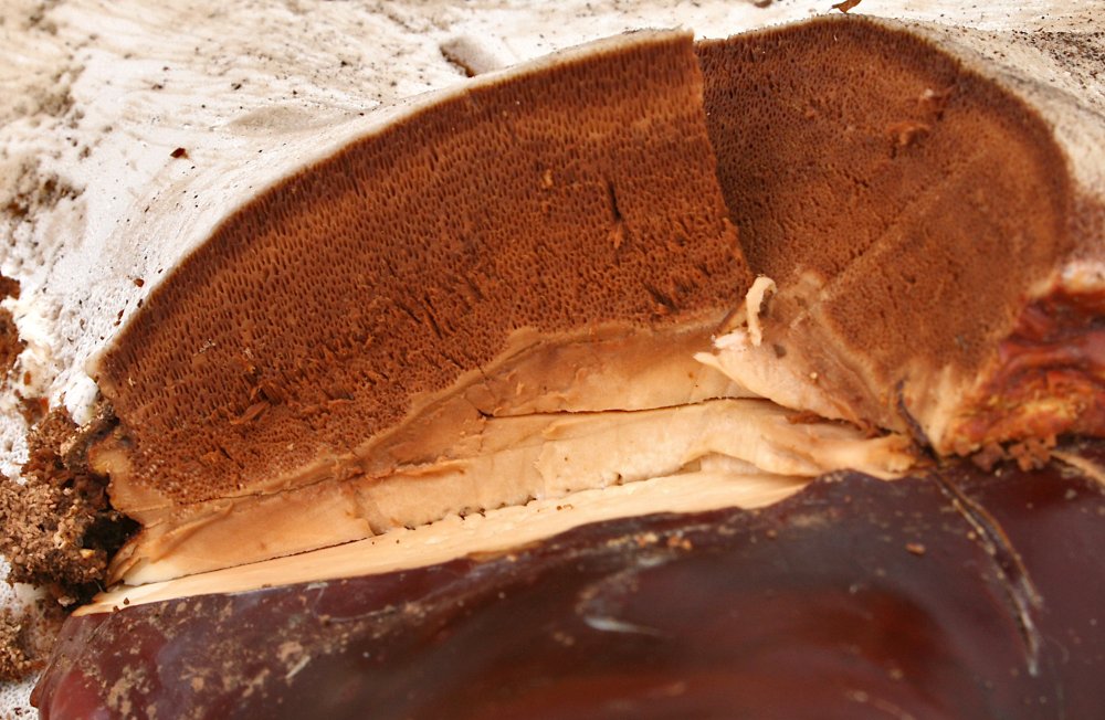 Trama hell-lehmfarben; 4 – 5 Poren pro mm, Hymenium dunkel rotbraun, ca. 1,5 cm dick – ich glaube 4 Schichten zu erkennen – der gesamte Frk. einschl. Stielspitze lässt sich gut schneiden, nur leicht korkig, sehr nass (der gesamte Frk. wog frisch 650 g).