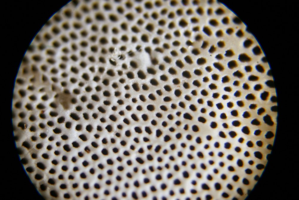 Am 10.8.25 mit Hut voller Sporen, von oben und unten: Am 20.8.25 war ich wieder dort und habe den Hut "geputzt" (dabei ist er abgebrochen): Hier die Schnittbilder von unten (ich wollte den tollen Frk. nicht mitten durchschneiden): Die Poren 20x – Sichtfeld-Ø = 6 mm: Das Substrat, optimal-morsche Douglasie, mit noch 4 weiteren ganz jungen "Knubbeln": Bilder von Lothars Aufsammlung auf Douglasie: Geblitzter Schnitt vom Exsikkat: Über Hinweise zur Klärung würden wir uns sehr freuen!