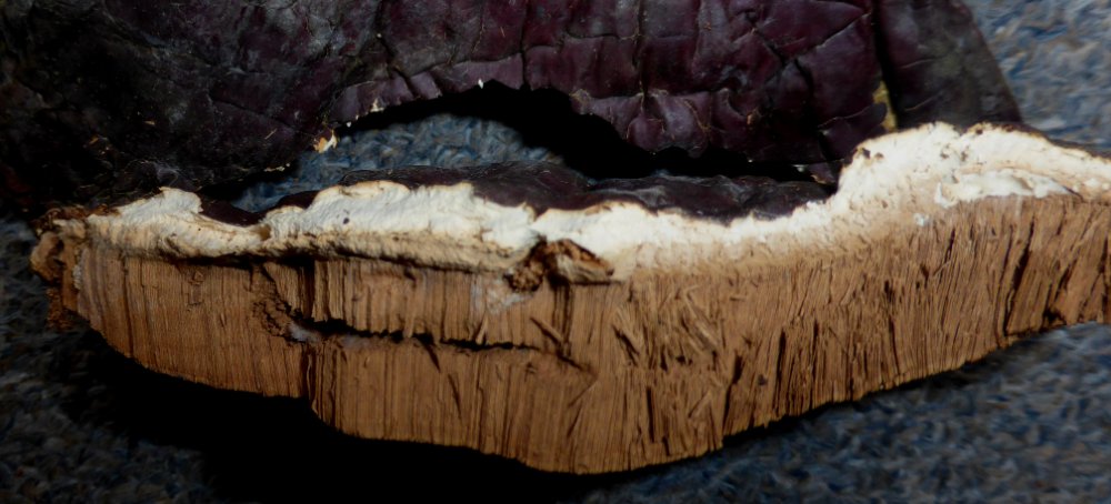 Die Beschreibung von valesiacum durch Boudier würde wiederum gut auf Lothars Fund passen: "Hut sitzend oder subsessil, 7 cm oder mehr breit, halbmondförmig, lackiert, glänzend, kastanienbraun oder blutrot, subkonzentrisch gefurcht, ..." Aber über das Substrat schreibt er: de plus par son habitat sur Méleze." – also auf Lärche!