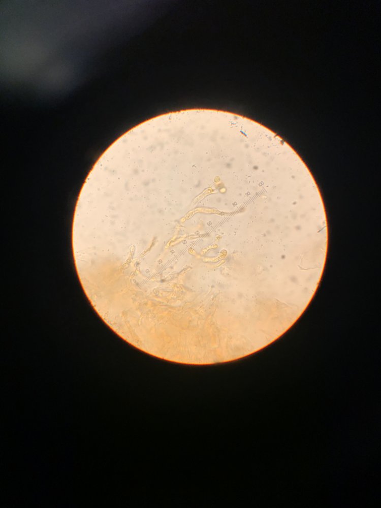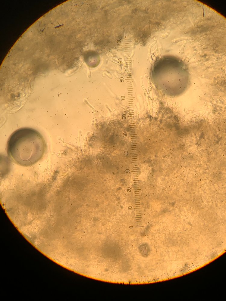 Zystiden: tibiform, ~60-80µM, teilweise mit lockerer Inkrustierung von Basis bis Mitte