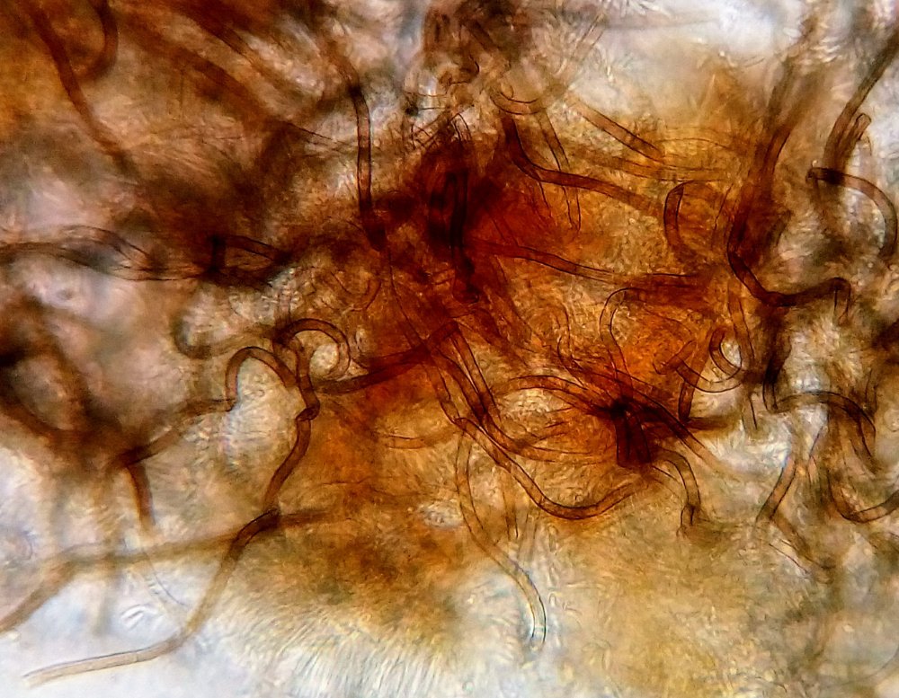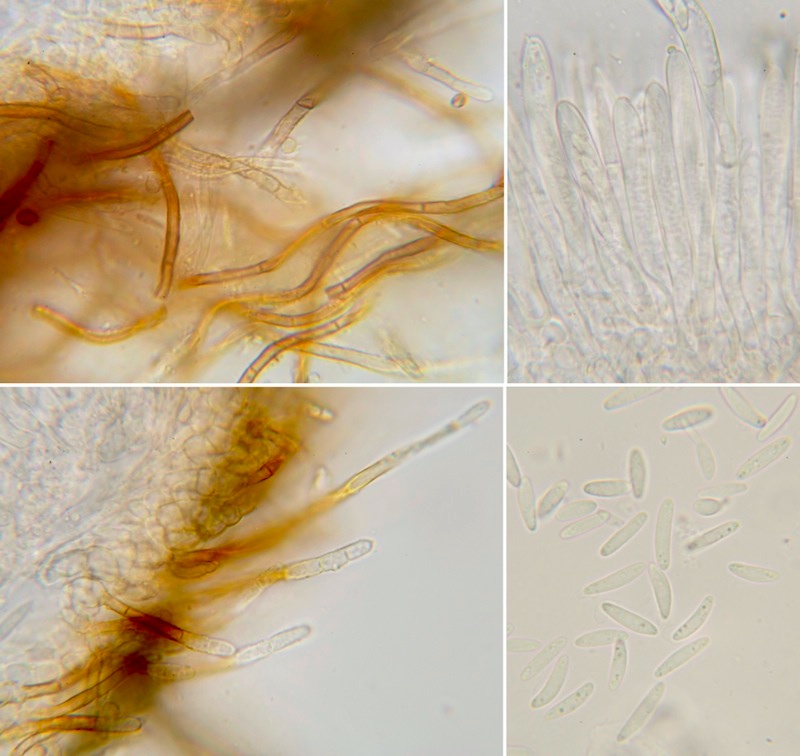 An einem Stammstück daneben wuchsen ähnlich große Fruchtkörper, die aber nur wuschelige Häufchen bildeten. Neben rostbraunen Hyphen schwammen unzählige Konidien (?). Könnte das ein Anamorphe der gleichen Art sein? Wer weiß mehr?