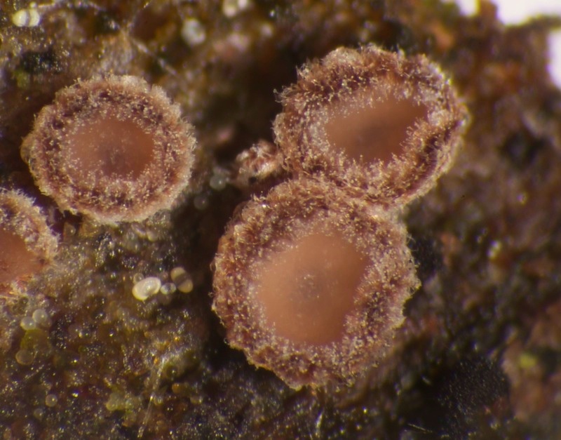 Trichopeziza subsulphurea ist sehr wohl eine gute Art. Diese wuscheligen Häufchen haben aber stark schlängelnde Haare und sind die Nebenfruchtform von Lasiobelonim variegatum.
