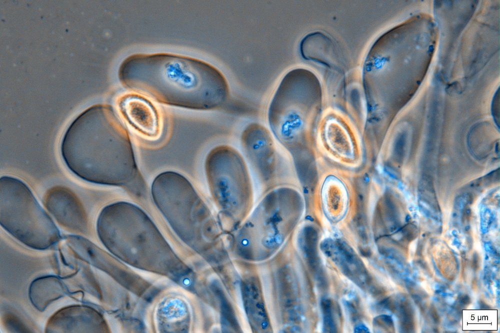 Gruppe Denudata (Tröpfchen an den L) war eindeutig und nach Mirkoskopie bin ich mit der Fungi Europaei 14 auf Hebeloma populinum gekommen – auffällig waren die sublimoniformen, großen, warzigen, dextrinoiden Spund v. a. die Cheilozystiden mit großen Köpfen, die teilweise spatelförmig ausgebildet sind. Meine Frage richtet sich an potenzielle Finder (IKG, CH, GF etc.), habt ihr das auch beobachtet bzw. ist bei Versterholt (FNE 3) eine H. vaccinum var. cephalotum angeführt, die ich nicht einschätzen kann. Auch H. ammophilum, die ich ebenfalls nicht kenne, gehört offensichtlich in diesen Dunstkreis.