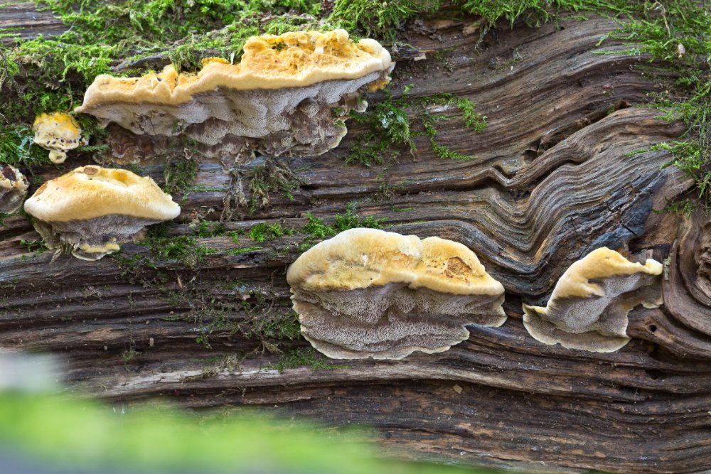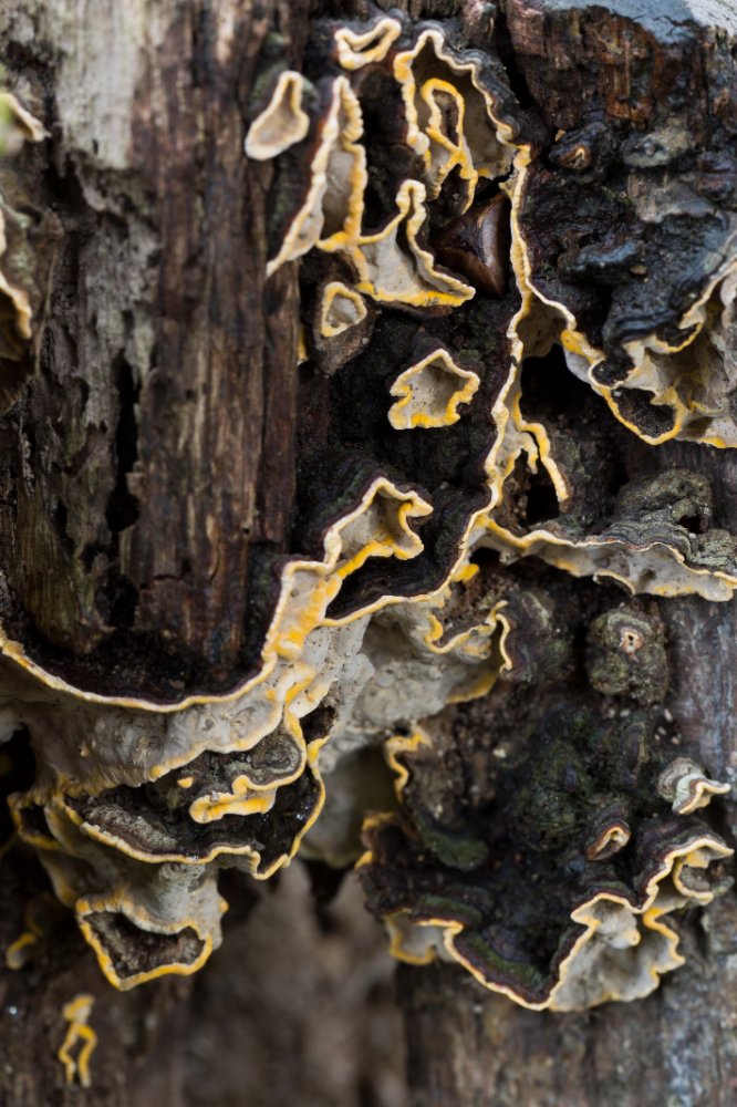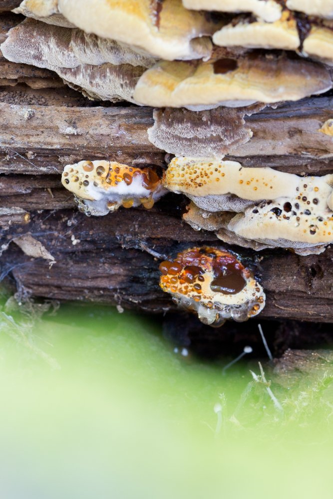 Eine schillernde Figur gibt (hoffentlich) Xanthoporia radiata auf einem abgestorbenen Laubbaum (wahrscheinlich Fraxinus) ab; hier kam er gemeinsam mit Ischnoderma resinosum und Picipes badius vor: