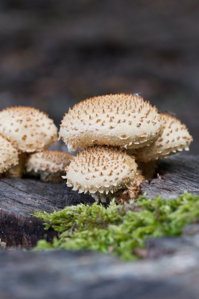 Auch stachelig aber mit Hut und normalerweise noch häufiger ist Pholiota squarrosa: