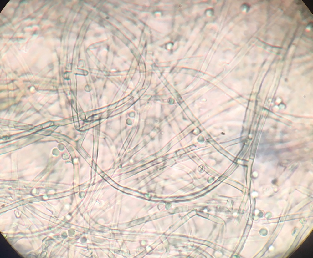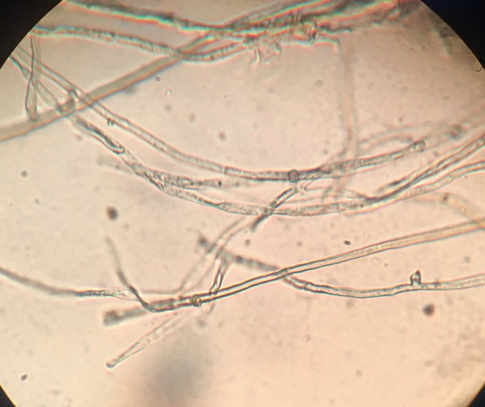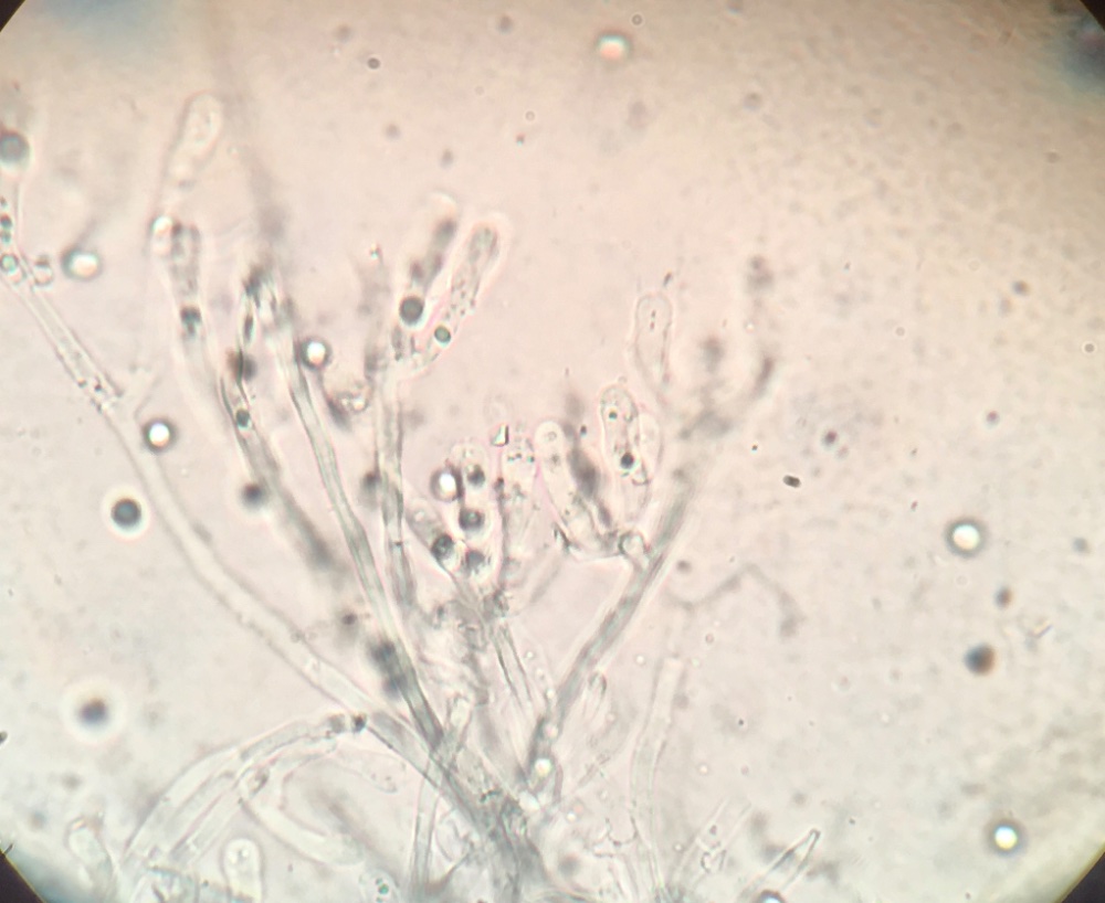 während der gestrigen Exkursion mit Wolfgang fand ich versteckt unter Laub einen hellblauen Rindenpilz, wie ich meine. Im pilzforum.eu meinte jemand, es könnte sich um Amaurodon handeln. Ich bin den Schlüssel auf tomtella.de durchgegangen, komme aber auf kein eindeutiges Ergebnis, da ich nichtmal sagen kann, ob die Sporen ornamentiert sind oder glatt. Ich habe Mirkofotos angefertigt, vielleicht fällt euch ja dazu was ein. Die Sporen sind recht klein, ca. 4-5 x 3 - 4. Ich denke, Schnallen sind teilweise vorhanden.