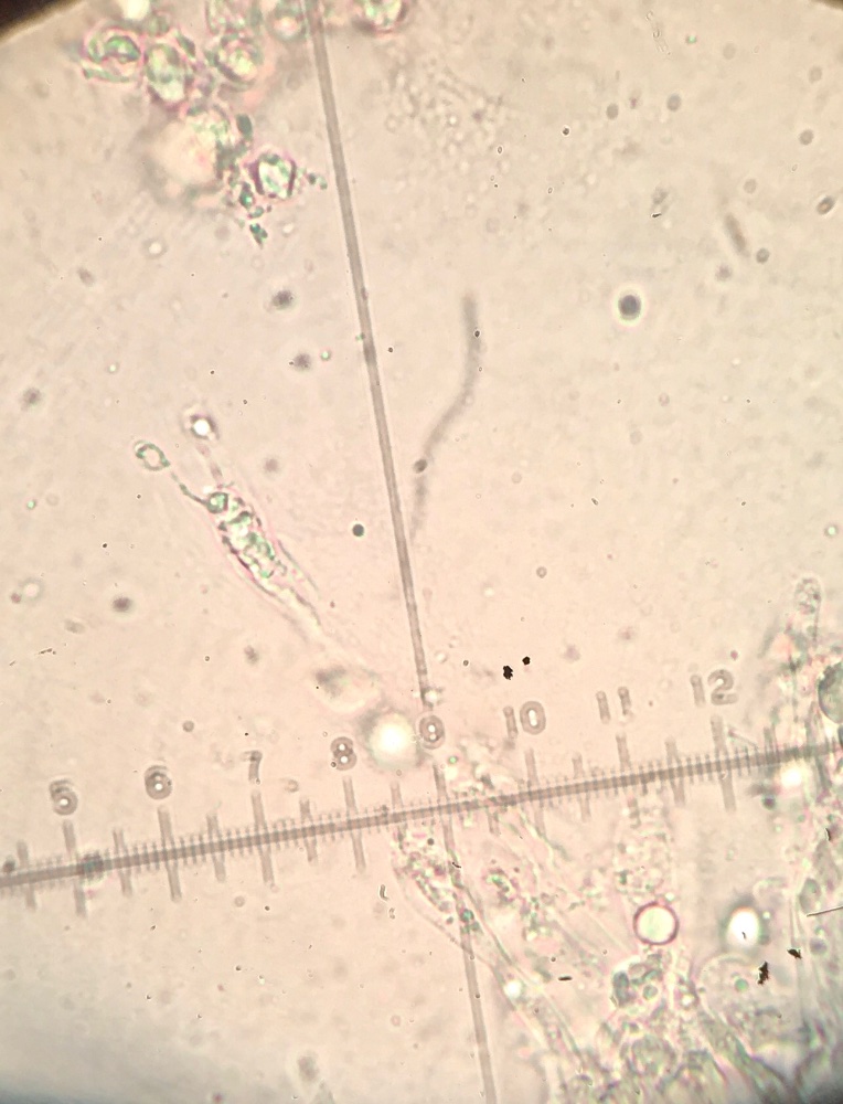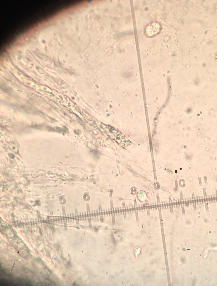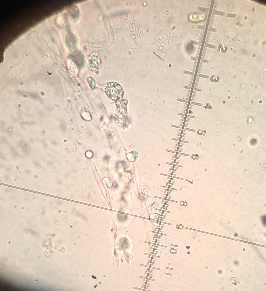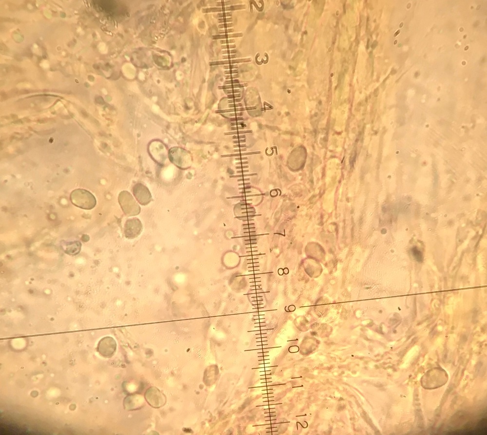 Die Sporen machen mich etwas ratlos, denn manche sind glatt und messen 5 - 5,5 x 4 - 5, die anderen sind granuliert (ich denke sie haben einen Inhalt) und messen 6 - 8 x 5. Ich nehme mal an, das sind reife und weniger reife Sporen. Überhaupt war es schwierig zu erkennen, was Sporen sind und was nicht.