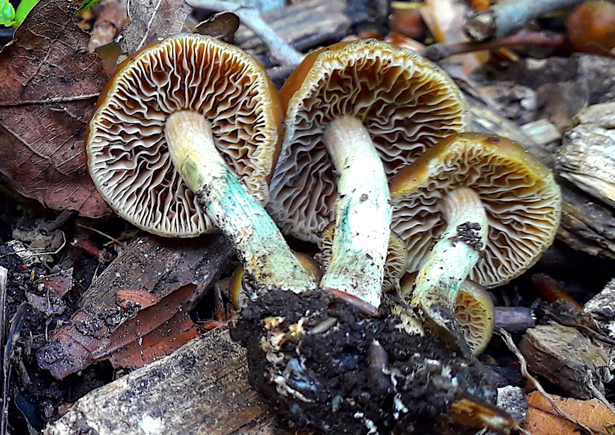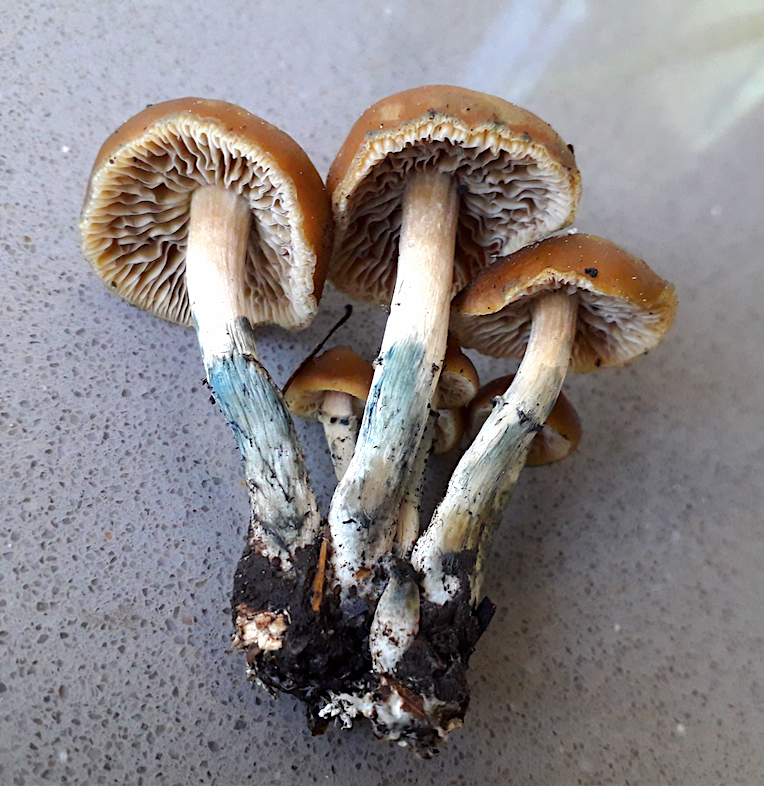an den Stellen, an denen ich sie angefasst hatte. Die Pilze weisen Ähnlichkeit auf mit Psilocybe cyanescens, aber dieser