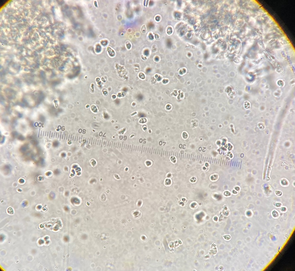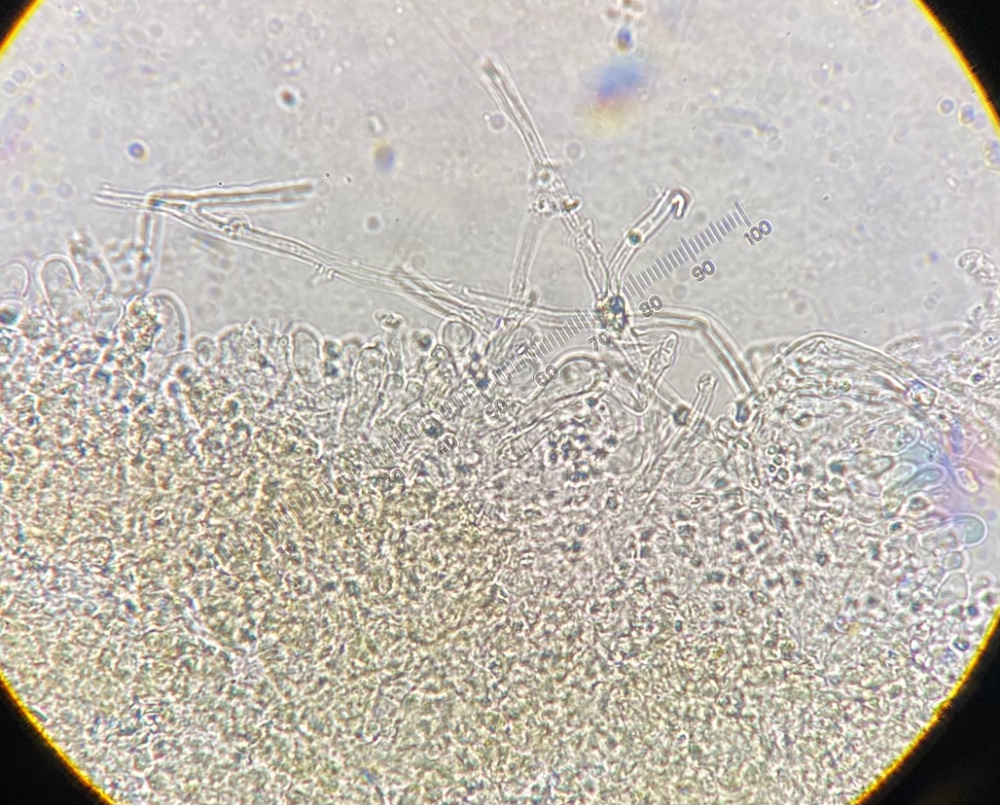 Die Sporen sind oval und messen 3,5-4x2-2,5 und sind glatt. Die Basidien sind 4sporig, manche auch 6sporig.