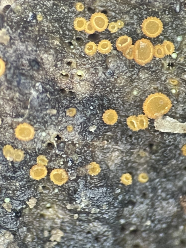 bei diesem orangen Becherchen brauche ich eure Hilfe. Ich habe dieses auf Totholz im Auwald an der Dornbirner Ache gefunden. Die Apothezien sind ca. 0.5 mm groß und sitzen direkt auf dem Substrat auf.