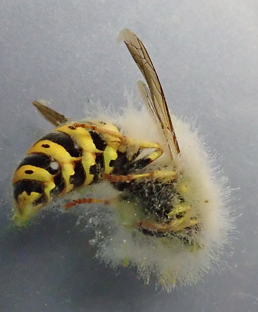 Eine ertrunkene Wespe ist von einem "Wasserschimmel" (Oomyceten) befallen.Pilze machen nirgend und vor nichts halt.