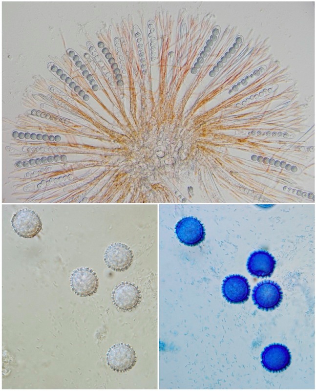 Auf morschem Laubholz fanden wir eine einzelne Pachyella, die schwierig einzuordnen ist. Eine gelbliche Flüssigkeit konnte ich nicht beobachten, die Sporen sind rau, die Haarhyphen-Schicht ist mehrere 100 µm dick – so kommt man eigentlich zu P. violaceonigra aber die Makroskopie wäre dafür etwas untypisch. Leider ist die Gruppe um P. violaceonigra/pseudosuccosa/aquatilis ziemlich schwierig, weshalb ich den Fund nun mal als Pachyella cf. violaceonigra abgelegt habe.