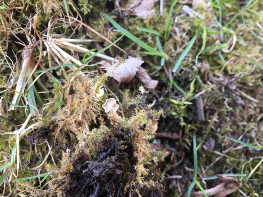 Neben vielen Ciboria-Kollektionen und einigen Sarcoscypha-Fruchtkörpern, die aber allesamt noch auf Betimmung warten, konnte ich diese hübschen Moosparasiten entdecken, die ich (nach zugegebenermaßen flüchtigem Blick durchs Mikro) als Arrhenia retiruga bestimmt hätte.