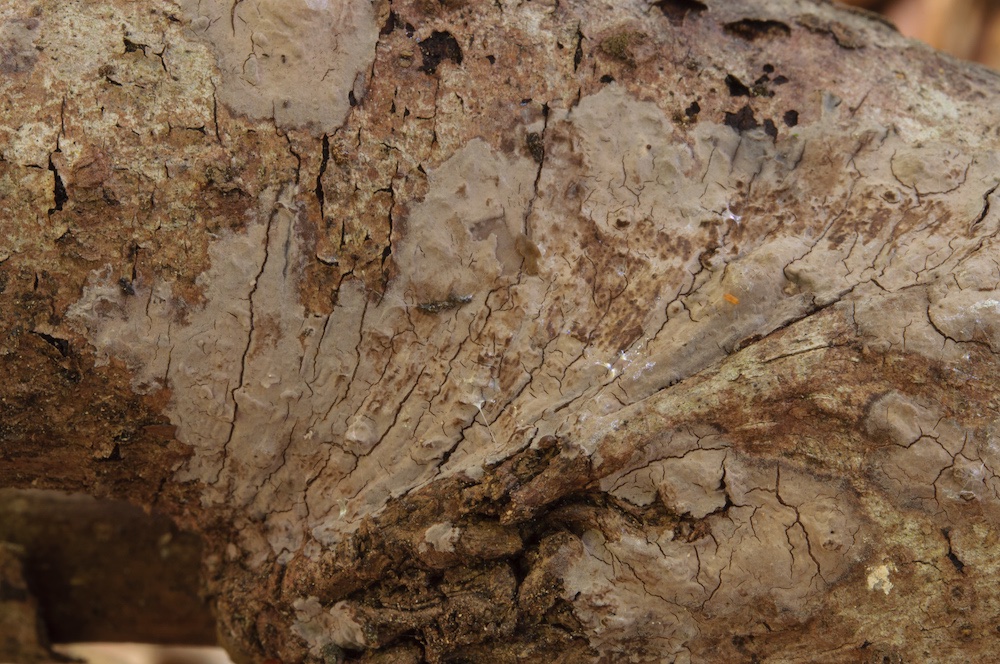 Peniophorella pallida: Nadelholz-Ast (vermutlich Pinus).