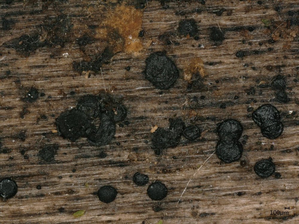 auf Laubholz, wahrscheinlich Carpinus, wuchs dieser kleine schwarze Discomycet mit zweizelligen braunen Sporen. Er ist viel kleiner als Patellaria atrata und mikroskopisch natürlich auch was anderes. Hat jemand von euch einen Tipp?